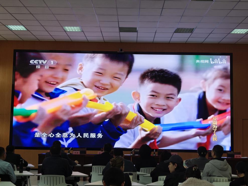 会后,全体教职工集中观看专题片《反腐为了人民》。