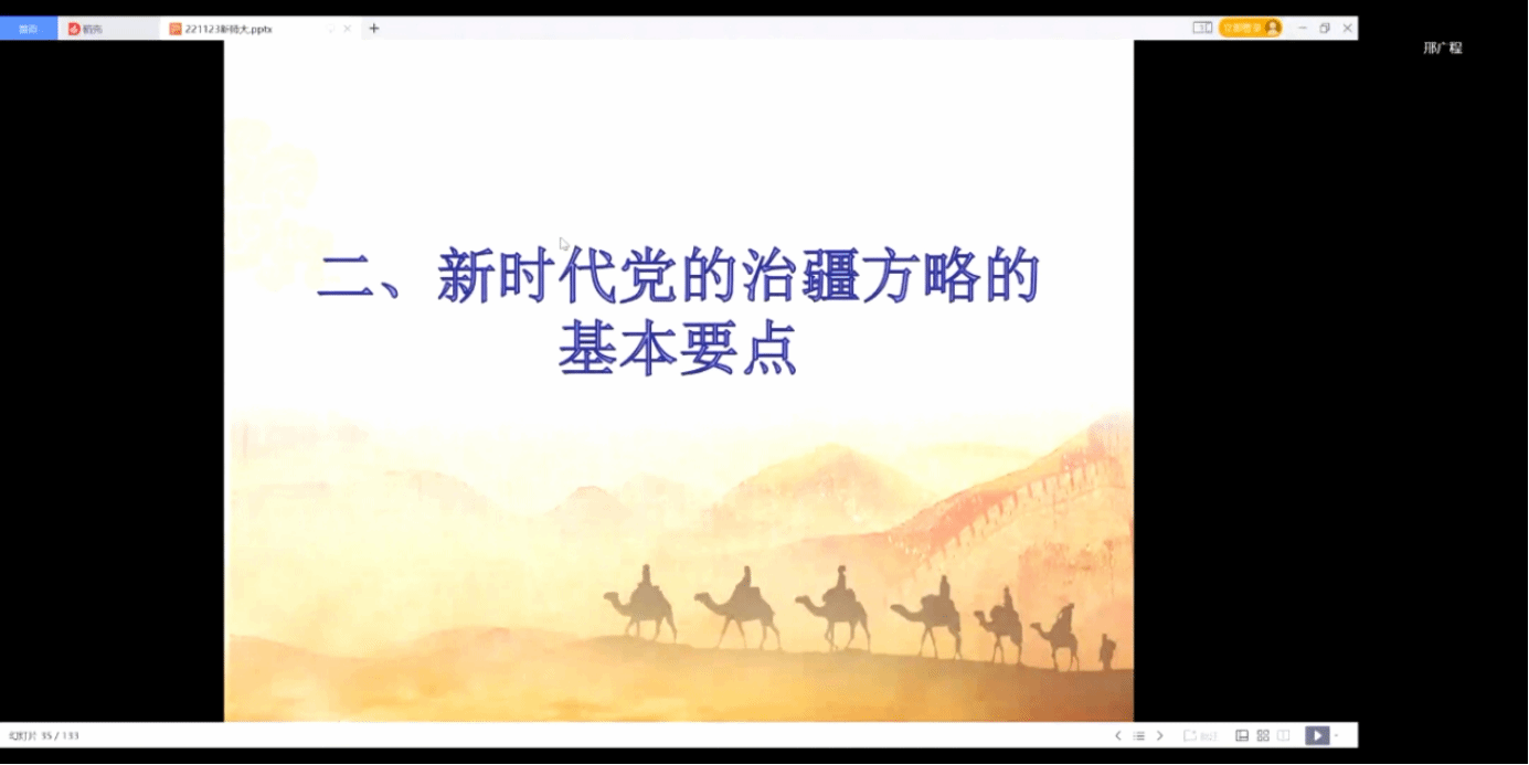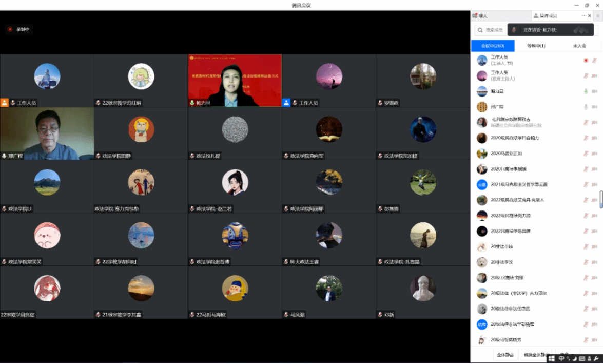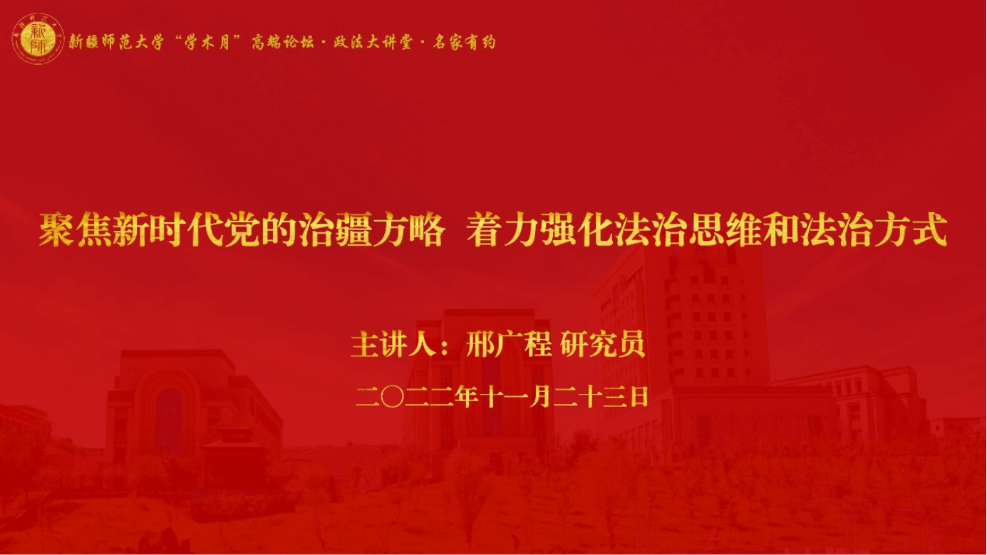 讲座中,邢广程研究员以“聚焦新时代党的治疆方略,着力强化法治思维和法治方式”为题,围绕党的十八大以来党中央深化认识和把握治疆规律的一系列国家领导人讲话、中央新疆工作座谈会部署、“十四五”和2035年远景规划等政策文件,特别是结合党的二十大报告内容,向在线聆听的广大师生生动阐释了新时代党依法治疆方略的重要性,探讨了依法治疆过程中形成法治思维、法治方式的理论逻辑和实践遵循,并结合国际形势、国家“双循环”战略布局等分享了他个人的学术观点。