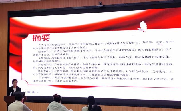 本次答辩会共有12支队伍参加。参赛项目选题丰富多样,覆盖社会科学、哲学社会科学和科技发明三个参赛类别。项目汇报人根据抽签顺序依次上台展示。他们准备充分,借助详细的报告、直观的图表和精致的PPT展示,深入分析项目的创新性和社会价值,以精彩纷呈的方式阐述各自项目的核心要点、独特优势、运营模式及发展蓝图,充分彰显当代大学生立足社会科学领域和科技创新领域的创新巧思与投身创业的澎湃热情。